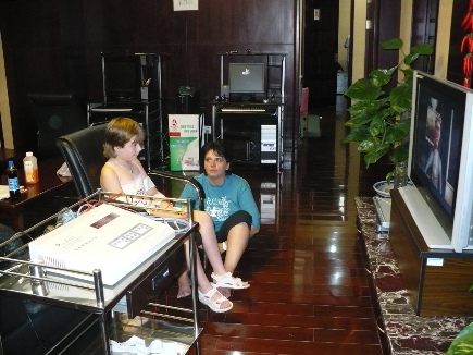 Van néhány dolgozó, aki segit minket, pl angolról kinaira forditással, vagy ha szükségünk van valamire beszerzik, vagy elkisérnek, és megmutatják hova kell menni. Szinte éjjel nappal nekünk intézkednek, és ha meglátnak a folyosón azonnal jönnek, kérdezik, minden rendben van-e. Képesek egész nap mosolyogni az emberre. (Ehhez otthon nem igazán vagyunk hozzá szokva! Otthon inkább jellemző, hogy 1 órára van időpontunk, és 3/4 1-re érünk oda, az orvos már sehol sincs. Ezek után telefonon csak annyit mond, hogy sajnálom.)