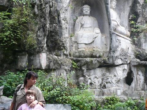 Vasárnap szabad..... Irány Kína egyik legnagyobb kolostora, a Lingyin Si (a Lélek Rejteke kolostor). Csodálatos látvány a természet közepén, aligha lehet egy nap alatt minden zugát megismerni. Lilánk is jól érezte magát, neki felért egy komolyabb rehabbal. Rengeteg a lépcső, és ő boldogan menetelt végig rajtuk. Aki ide jön annak ezt nem szabad kihagyni. Egy kép a kolostorhoz vezető útról, ahol a sziklafalba vésett több tucat óriási buddhista szobor gondoskodott róla nehogy eltévedjünk. Smile