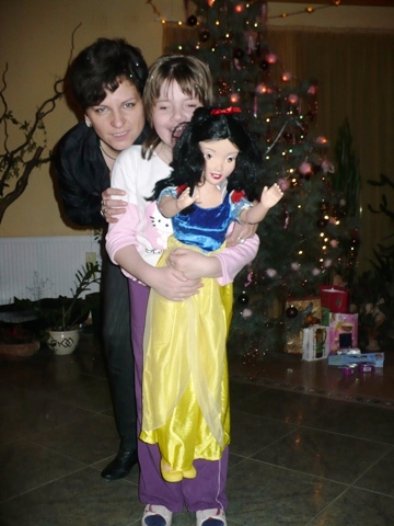 Nálunk a szent este nagycsaládi összejövetel, itt kerül a fa alá mindenki ajándéka, igy még egy egészséges kisgyerek is a bőség zavarával küszködne. Lilám fejlődése ellenére igy lesz ez nálunk is - gondoltam. Tévedtem! Lili csomagolt, örült, és játszott! Kiválasztott az ajándékaiból 3-at, ezek a kedvencek. Ezekkel játszik napok óta! Soha nem babázott... Edina meglepte egy óriási Hófehérkével, azóta mindenhova jön velünk. Fésülgeti, ölelgeti, szeretgeti! Jön velünk az autóban, és vele alszunk! Ez aztán a haladás!