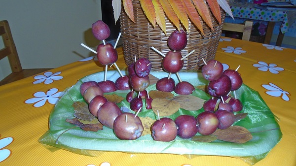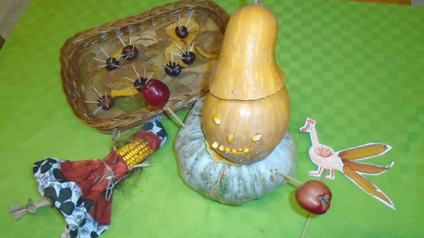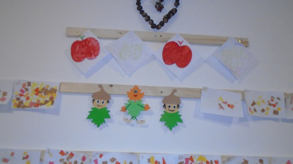 Tanév kezdetekor a széles ablakpárkányokra kosárkákat helyeztem, őszi gyümölcsökkel, zöldségekkel raktam tele, ide kerültek a termések is, dió, mogyoró. Együtt sétáltunk az erdőbe, itt gyűjtöttünk makkot, száraz leveleket, kis ágakat, ezek mind helyet kaptak a kosarakba.